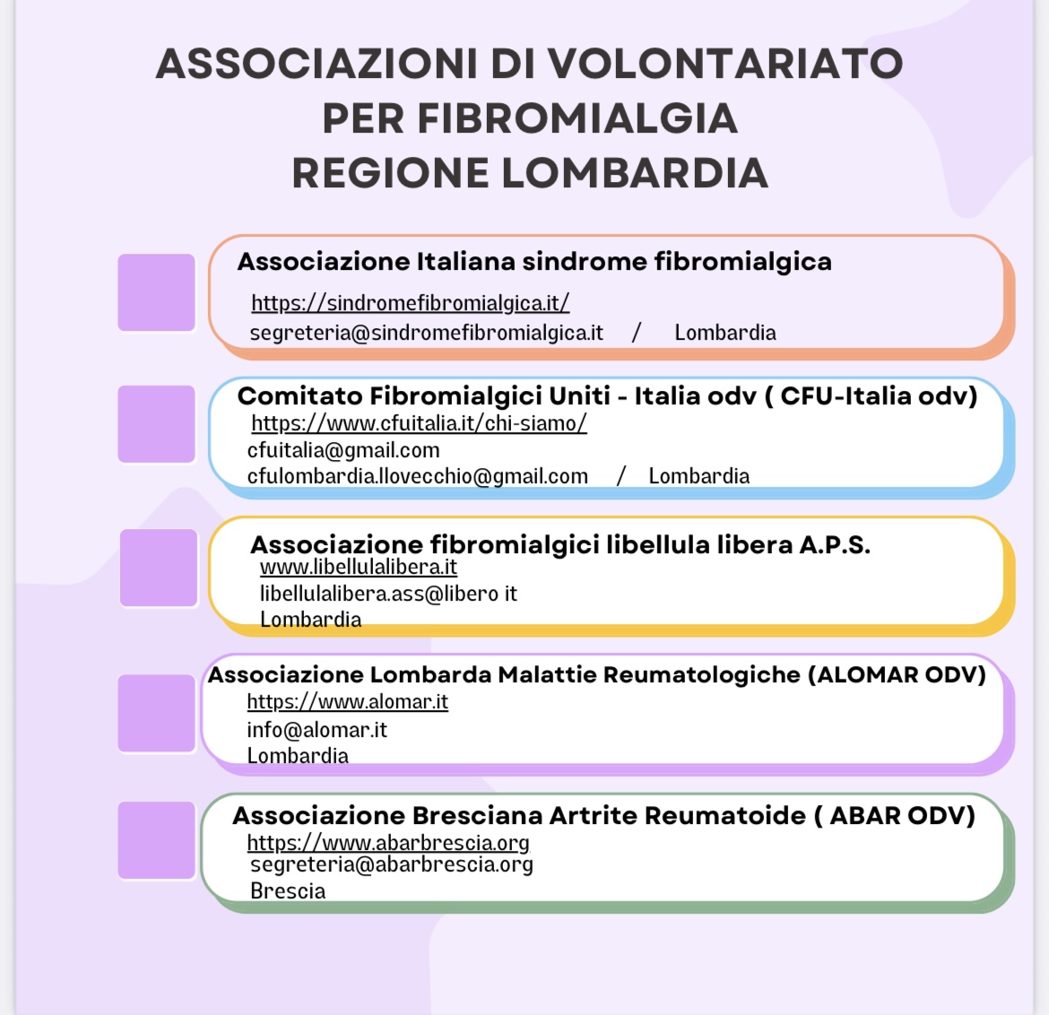 I centri si avvalgono del supporto della Commissione per la Formazione Continua e la Comunicazione, all’interno della quale collaborano tutte le associazioni di volontariato per fibromialgia della regione Lombardia.